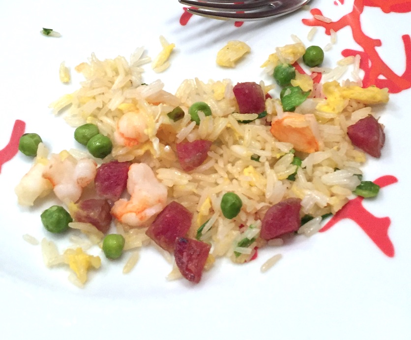 – Il est agréable de garnir le riz cantonais de saucisse chinoise : une saucisse qui est légèrement sucrée et parfumée aux épices et/ou à un alcool de riz chinois. Elle ne ressemble à aucune charcuterie de chez nous : nos traiteurs la remplacent hélas trop souvent par des lardons ou des dés de jambon cuit. Le jambon cru est un moindre mal, si on n’a pas de saucisse chinoise à portée de main. Mais ce n’est quand même pas du tout le même goût, quoi qu’on en dise.