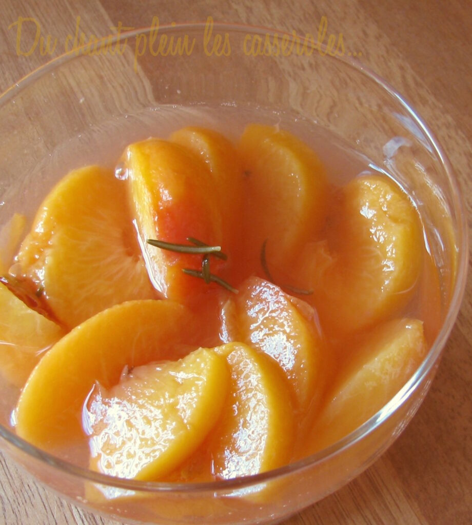Portez l’eau, le miel, le safran et les aiguilles de romarin à frémissement. Ajoutez les pêches détaillées en quartier (éventuellement épluchées, mais je ne trouve pas que ce soit indispensable).