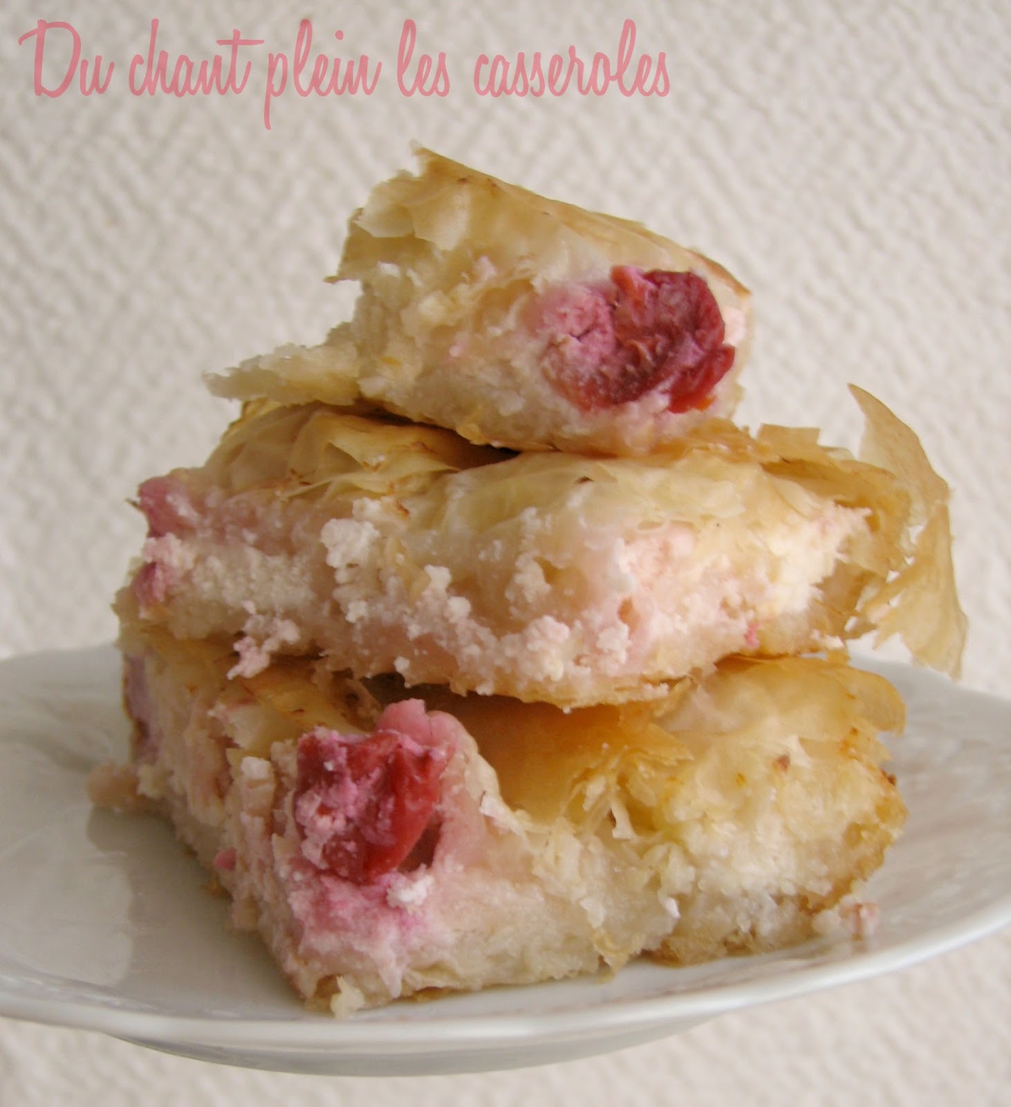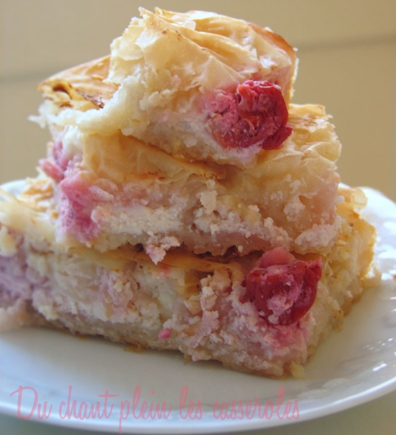 J’avais envie d’une version de cheesecake vaguement inspirée des pâtisseries orientales. D’un cheesecake qui se prendrait pour un baklava. Le croustillant de la feuille de filo, et le crémeux du fromage, la douceur d’un sirop imbibant le tout Des griottes pour la fraîcheur et l’acidulé, un léger parfum de fleur d’oranger pour le côté oriental. C’était tout à fait délicieux. Paradisiaque. Réconfortant.