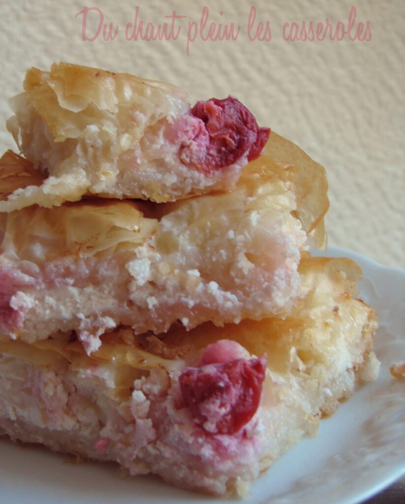 J’avais envie d’une version de cheesecake vaguement inspirée des pâtisseries orientales. D’un cheesecake qui se prendrait pour un baklava. Le croustillant de la feuille de filo, et le crémeux du fromage, la douceur d’un sirop imbibant le tout Des griottes pour la fraîcheur et l’acidulé, un léger parfum de fleur d’oranger pour le côté oriental. C’était tout à fait délicieux. Paradisiaque. Réconfortant.