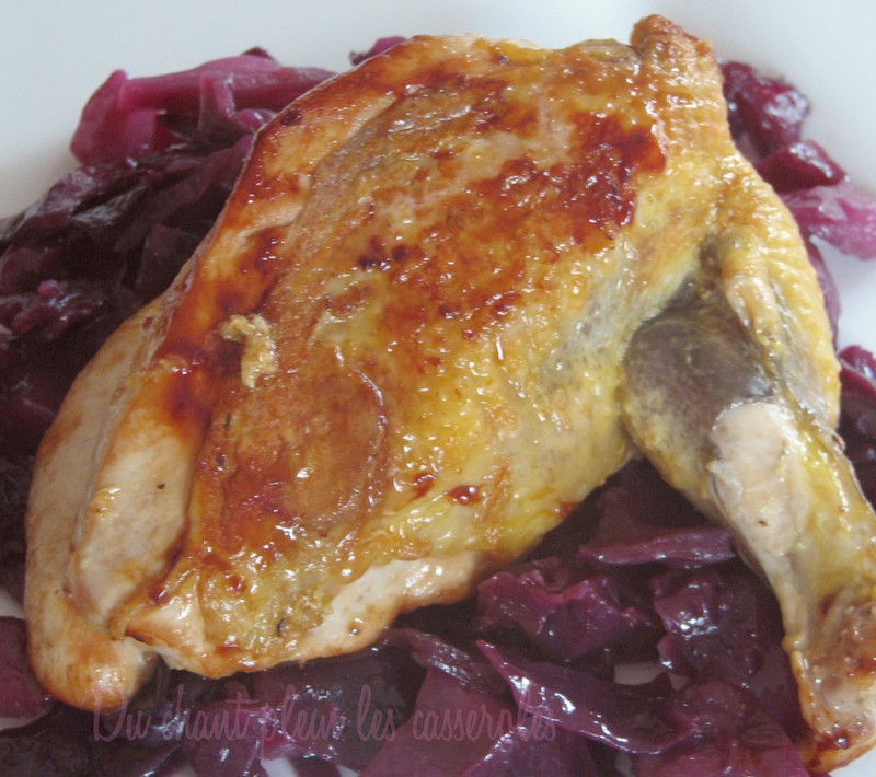 Suprêmes de pintade et confit de chou rouge aux pommes