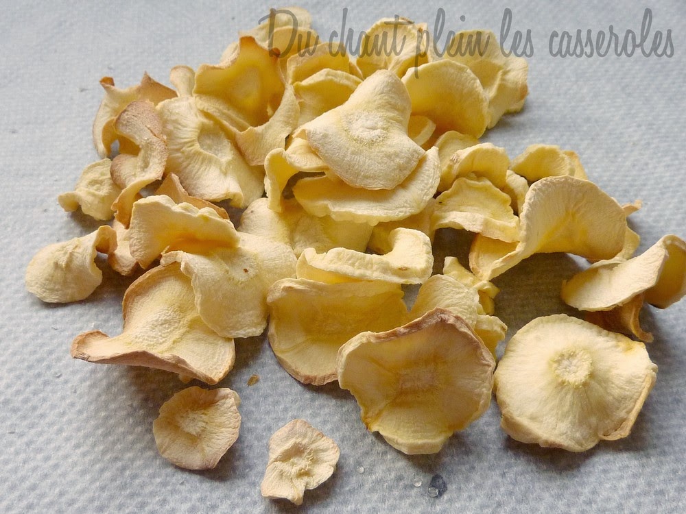 2. 120° C pendant 1h au moins, de façon à les faire sécher, pour un résultat croquant (un peu comme des pommes séchées). A savourer froid à l’apéritif, cela change agréablement des chips et c’est moins lipidique.