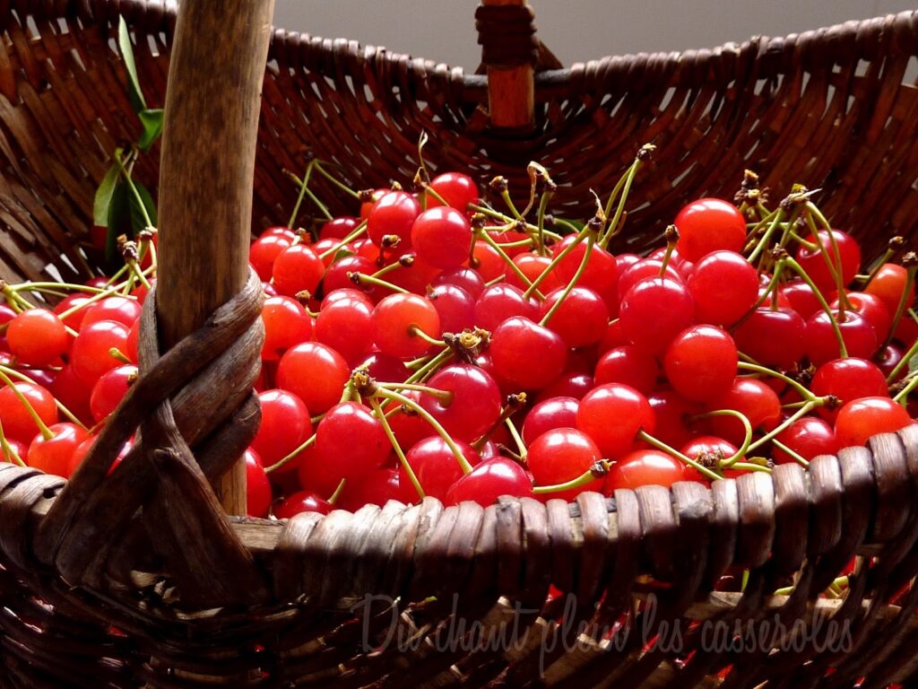 Par griottes, j’entends les cerises Montmorency (ci-dessous), rouge vermillon, chair blanc crème, chair molle et très juteuse.