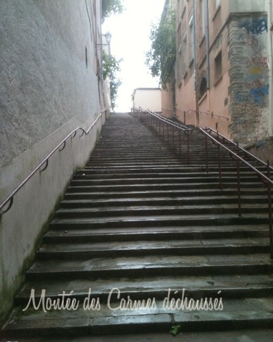 J’escalade la colline de Fourvière pour rejoindre, après des centaines de marches d’escalier (pas moyen d’y aller autrement), un dépôt d’archives installé dans un ancien couvent de Carmes déchaussés (je suis montée à pied, mais chaussée…)