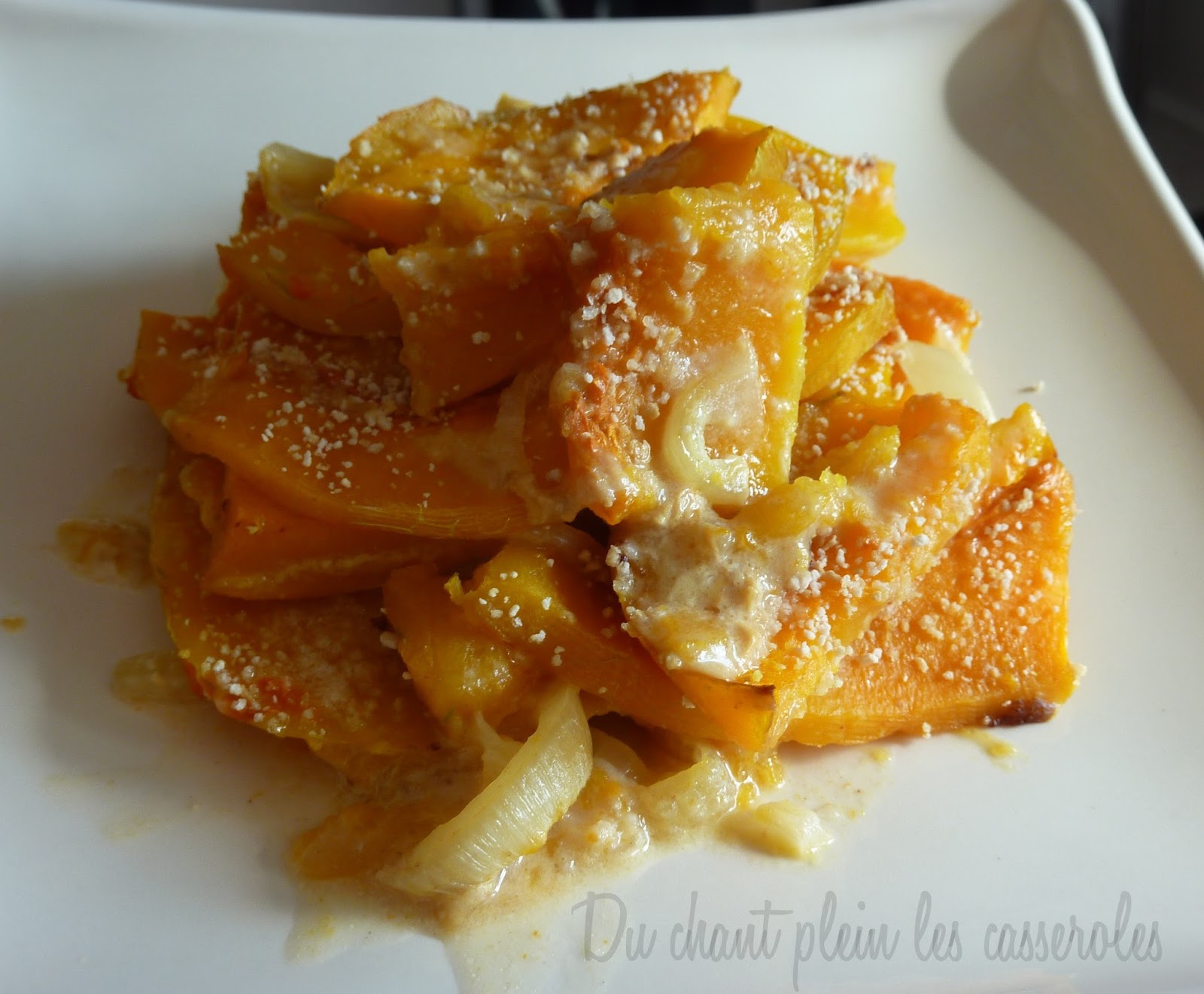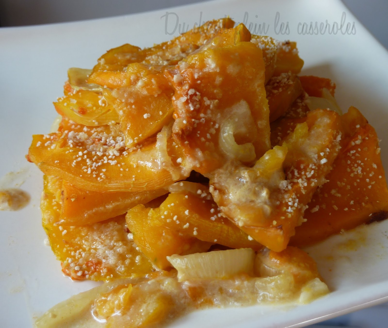 4. Disposez les lamelles de courge et les oignons dans un plat à four en céramique. Salez, poivrez, parsemez de crème liquide, ajoutez la chapelure et couvrez d’un papier aluminium. Enfournez pour 30 minutes environ. Au bout de ce temps, retirez le papier aluminium et laissez cuire encore 15 minutes. Si la courge absorbe trop de liquide et menace de sécher, rajoutez un peu d’eau en cours de cuisson.