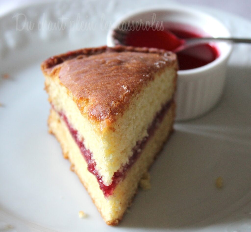 La version que je vous propose permet d’obtenir un biscuit d’une très belle épaisseur, aéré, tendre et peu gras. La texture est souple mais d’une excellente tenue, ce qui le rend apte à être coupé et garni de ce que vous voudrez. J’aime bien le fourrer d’une généreuse couche de gelée de framboises. Mais il ne perd rien de sa délicatesse si on le sert nature, simplement recouvert d’un petit glaçage et/ou accompagné d’un coulis de fruits ou d’une crème anglaise.